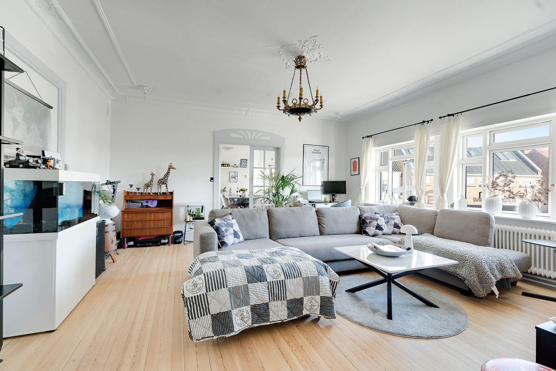 Boligen er indrettet med åbent køkken i direkte forbindelse til en dejlig og velbelyst spiseplads og opholdsstue. Fra opholdsstue er der adgang til terrasse. Det gennemgående gulv i køkken, stue og værelser er et slidstærkt laminatgulv i egelook. I badeværelse og entré er der fliser. Entréen har desuden en undersænket måtte. Køkkeninventar er fra HTH med hårde hvidevarer. Køkkenet er udstyret med induktionskogeplade, emhætte, ovn og køl/frys. Desuden er der afsat plads og udført installationer til en opvaskemaskine ved køkkenvasken. I badeværelset er der afsat plads og udført installationer til vaskemaskine og tørretumbler.