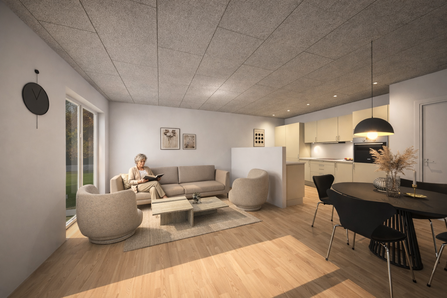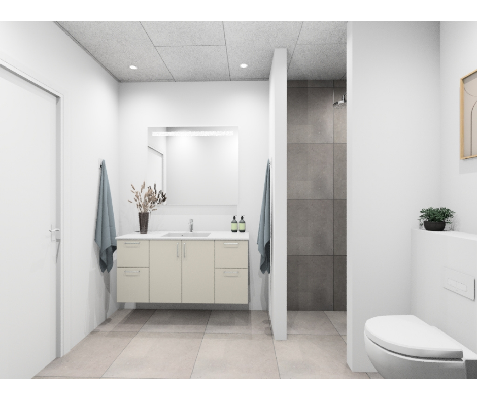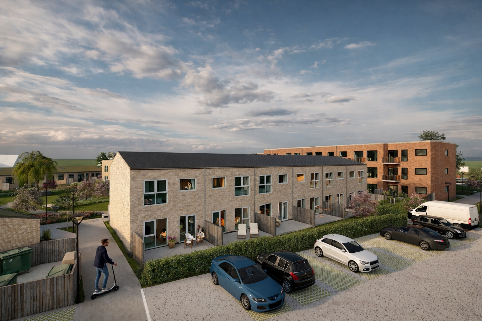 Bygning 3 omfatter fire attraktive rækkehuse på 100-103 m², hvor der er prioriteret både komfort, lys og en planløsning med god anvendelighed. Boligerne passer godt til dem, der ønsker lidt ekstra plads og en bolig, hvor hverdagen glider nemt.Hver bolig indeholder tre soveværelser, køkken med ovenlysvindue, et badeværelse samt en praktisk entré med vaskemaskine og tørretumbler. Indretningen er skabt med fokus på gode rumforløb og en naturlig sammenhæng mellem boligens funktioner, så hjemmet opleves både rummeligt og velfungerende.Fra boligen er der adgang til en vestvendt terrasse, hvor eftermiddags- og aftensolen kan nydes i rolige omgivelser. Det grønne sedumtag er med til at give boligerne et moderne og harmonisk udtryk, som passer naturligt ind i den samlede arkitektur.Samlet set er boligerne i bygning 3 en boligtype med god plads, gennemtænkte løsninger og en behagelig balance mellem det praktiske og det æstetiske.Men det er mere end de enkelte boliger. Det er et lille samfund i det store – et sted, hvor man ikke bare bor, men hører til.I det fælles orangeri kan man følge årstidernes stille forvandling; mærke solens første forårsglimt i glasset og dufte sensommerens varme. Fælleskøkkenet summer af liv, når naboer samles til fællesspisning, fødselsdage eller en spontan middag på en helt almindelig tirsdag. I værkstedet får idéer lov at tage form, og hænder finder ro i det praktiske. Fitnessområdet gør det let at lade kroppen arbejde, mens snakken går, og i saunaens stille varme kan dagen rundes af i ro og velvære.Her er tænkt over balancen. Mellem det private og det fælles. Mellem stilhed og samtale. Du kan trække dig tilbage i dit eget hjem, lukke døren og finde ro – og samtidig vide, at fællesskabet venter lige udenfor, når du har lyst.Alle vores lejemål udlejes efter først-til-mølle-princippet. OBS Modelbilleder og plantegning er vejledende. Der tages forbehold for eventuelle ændringer i fællesområderne.