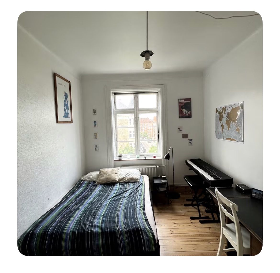 The apartment has two bathrooms and a shared kitchen, which you will share with 3 other students. The room will be furnished when you move in with a 140x200 cm bed, a desk, a closet, a mirror, and more. Of cause you are also welcome to bring your own stuff. Kitchen is also equipped. Rent includes everything: electricity, heating, water, internet, access to washing machines, etc. CPR registration. Car parking. Garden you can use.